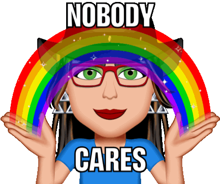 A Bitmoji girl in a cowboy hat and glasses shrugs with 'Nobody Cares' text, then forms a rainbow, symbolizing pride.