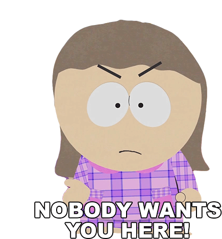 Heidi Turner from South Park angrily states, "Nobody wants you here!" with a stern expression.