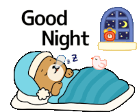 Анимированный стикер, показывающий спящего медведя с надписью "Good Night", переходящий в сонную девочку под одеялом с надписью "Good morning".