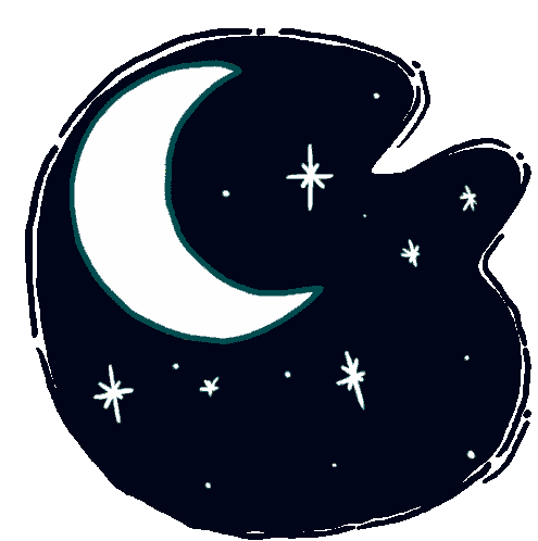 A hand-drawn sticker featuring a crescent moon, stars, and the word 'Buenas' on a dark night sky, conveying good night wishes.
