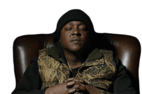 Jadakiss slowly nods his head in agreement while sitting in a chair, wearing a beanie and camouflage vest.