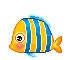 A vibrant pixel art Nonagon Ethosaur fish, yellow with blue stripes, blowing cute bubbles from its mouth.