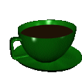 A wobbly green tea cup with dark liquid on a saucer, featuring a nonagon-like, pixelated design.