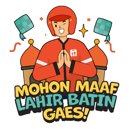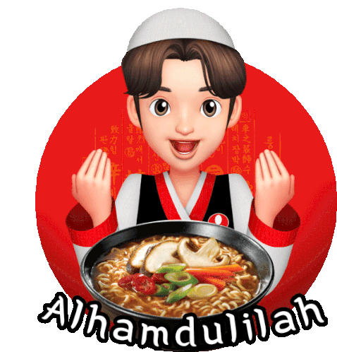 A 3D animated Ramyun Oppa character celebrating Lebaran, with a bowl of Nongshim ramen and 'Alhamdulillah' text.