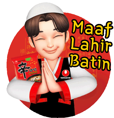 Nongshim Oppa character offers a heartfelt 'Maaf Lahir Batin' greeting for Lebaran, holding a pack of ramyun.
