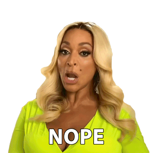 Karen Huger, from RHOP, emphatically says 'Nope' with a dismissive head shake. Perfect for expressing disagreement.