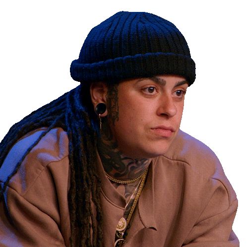 Jozzy from Ink Master with a 'not bad' facial expression, wearing a beanie and dreadlocks.