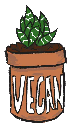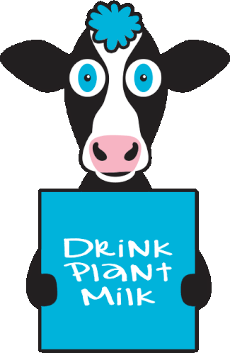 A cheerful cartoon cow holds a sign encouraging viewers to drink plant milk, promoting a vegan lifestyle.