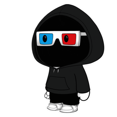 Animated character in a black hoodie and 3D glasses, performing a respectful hat tip or salute gesture.