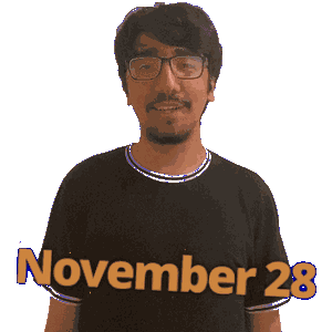 a man wearing glasses and a black shirt with november 28 on it