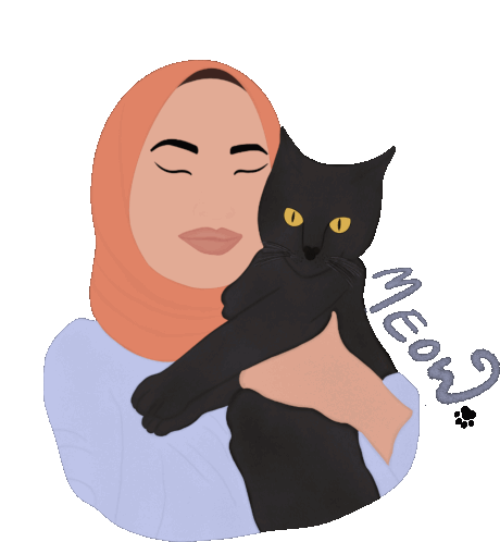 An illustrated woman in a hijab gently holds a black cat with bright yellow eyes, accompanied by a playful 'Meow' and paw prints.