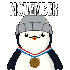 A cute Pudgy Penguin wearing a grey beanie and a medal, sporting a Movember moustache to support men's health.