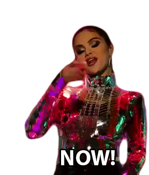 Selena Gomez strikes a pose with an urgent expression, emphasizing 'NOW!' and 'Right Now' with her powerful presence.