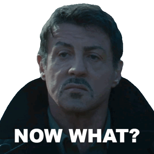 Barney Ross, played by Sylvester Stallone, asks 'Now What?' with a questioning look in this expressive sticker.