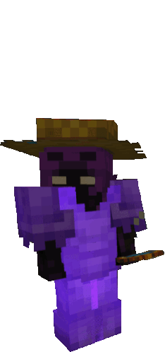 Noxintrus, a purple Minecraft character, bounces with energy, wearing a distinctive hat and holding a golden sword, ready for action.