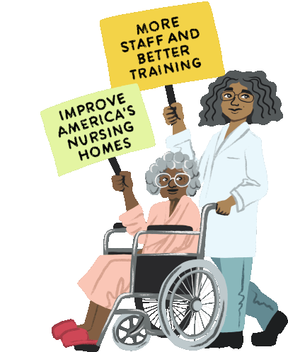 An elderly woman in a wheelchair and a nurse advocate for improving America's nursing homes with more staff and better training.