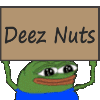 A pixelated green frog, resembling Pepe, holds up a sign that clearly reads 'Deez Nuts' with a wide smile.
