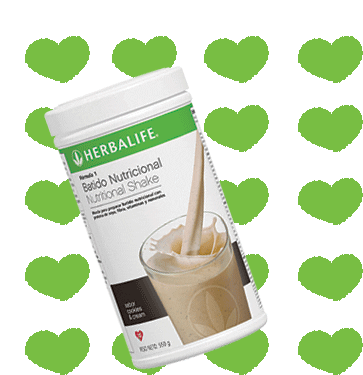 Herbalife Formula 1 Nutritional Shake in Cookies & Cream flavor, surrounded by green hearts, promoting healthy living.