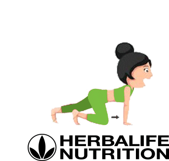 Animated woman in green activewear performs a crawling exercise, promoting Herbalife Nutrition for an active lifestyle.