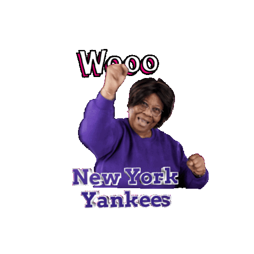 Enthusiastic New York Yankees fan cheering with fists raised, as 'Wooo' and 'New York Yankees' text animate around her.