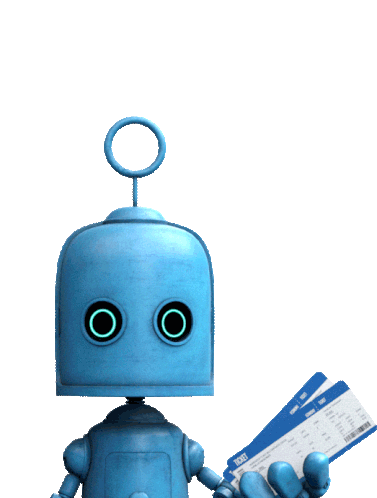 A friendly blue O2 robot with glowing eyes holds two tickets, ready for an event or travel.