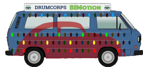 A festive blue Volkswagen T3 van, known as the 'Light Bus' from Obersuhl, adorned with colorful lights and a 'DRUMCORPS BIMOTION' sign, associated with Niklas Wagner.