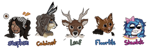Animated sticker featuring original characters Cabinet, Leaf, and Floortile, depicted as a rabbit, deer, and cat.