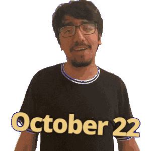 a man wearing glasses and a black shirt says october 22 in yellow letters