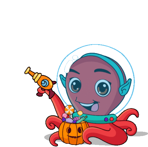 An adorable Octo Cimb space alien winks, holding a ray gun and a pumpkin bucket full of Halloween candy, with bubbles floating up.