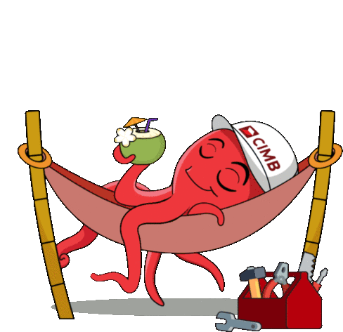 CIMB's Octo character enjoys a well-deserved rest in a hammock with a coconut drink, celebrating Happy Labour Day.