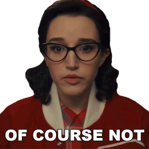 Jane, portrayed by Marisa Davila, from 'Grease: Rise of the Pink Ladies', expresses 'Of Course Not' with a surprised look, wearing glasses and a red jacket.