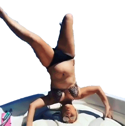 A woman in a bikini attempts a handstand on a boat, loses her balance, and comically falls into the water.