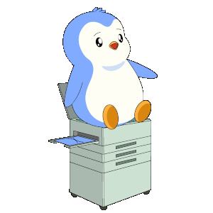 A cute, pudgy blue and white cartoon penguin sits on an office copy machine as papers print out.