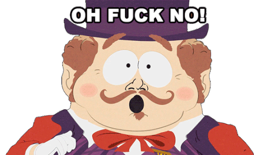 The Mayor of Imaginationland, a South Park character, reacts with wide eyes and an emphatic 'Oh Fuck No!'.