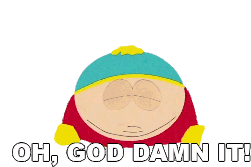 Eric Cartman from South Park expresses extreme frustration with his iconic "OH, GOD DAMN IT!" quote.