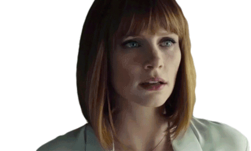 Bryce Dallas Howard as Claire Dearing reacts with "Oh God" in a moment of stress or realization from Jurassic World.