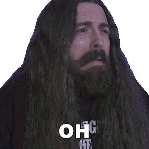 Samus Paulicelli, with long hair and a beard, reacts with 'OH GOD!' looking upwards in surprise or exasperation.