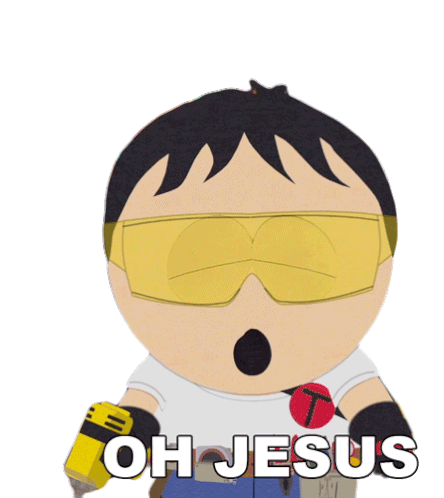 Stan Marsh as Toolshed from South Park, wearing yellow goggles and holding a drill, exclaims "Oh Jesus" in surprise.