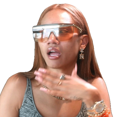Morgan Bledsoe reacts with a shocked 'Oh My God' expression, wearing large sunglasses and statement earrings.
