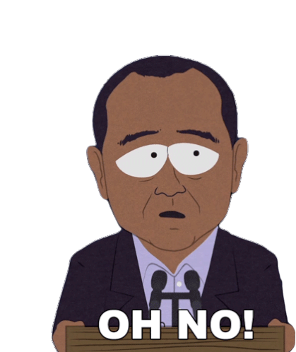 Barack Obama caricature from South Park reacts with an emphatic 'Oh No!' expression, showing surprise or dismay.