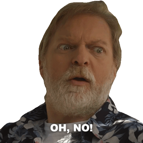 Uncle Howard from Final Destination Bloodlines reacts with a shocked 'Oh, No!' expression, wearing a floral shirt.