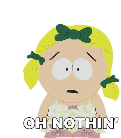 Butters Stotch, disguised as Marjorine from South Park, shrugs off a question in pajamas, saying 'Oh Nothin'.