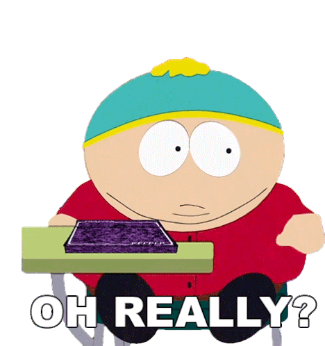 Eric Cartman from South Park, sitting at a desk, expresses disbelief with 'OH REALLY?' in this animated sticker.