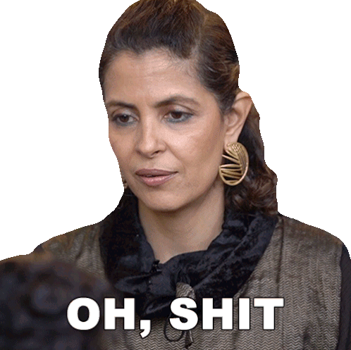 A woman with large gold earrings reacts with surprise, exclaiming 'Oh, shit' in a moment of sudden realization or shock.