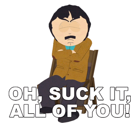 Randy Marsh from South Park, angry and sitting in a chair, exclaims "Oh, Suck It, All Of You!"