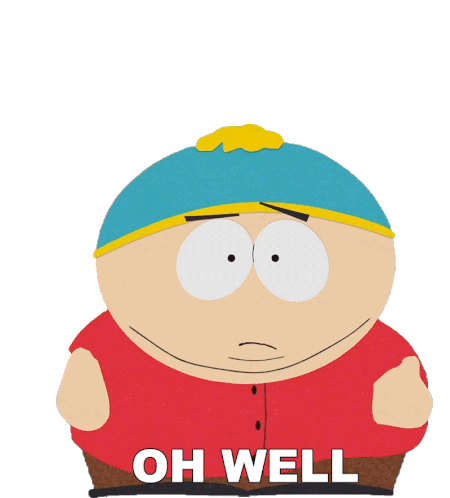 Cartman from South Park expresses "Oh Well" and then "Thank You" with changing facial expressions on a white background.