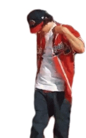Ohgeesy from Shoreline Mafia adjusts his red baseball jersey and cap, showcasing his hip-hop style and outfit of the day.