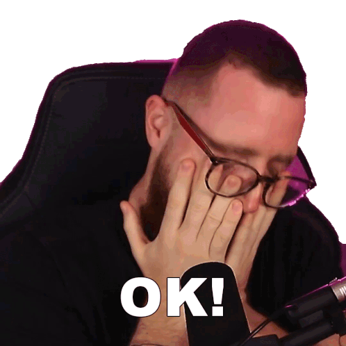 Luba, wearing glasses, covers his face with his hand, then smiles as the word 'OK!' appears.