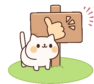 A cute white cat with rosy cheeks gives a thumbs up next to a wooden sign on green grass.