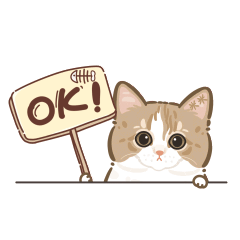 An adorable cat peeks over a surface, holding a sign that cheerfully says 'OK!' with a fishbone icon.